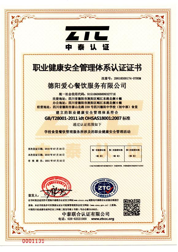 職業(yè)健康安全管理體系認(rèn)證證書