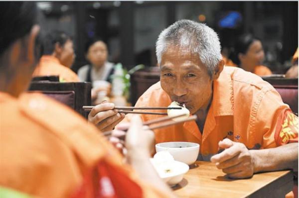 “環(huán)衛(wèi)工人們身上發(fā)生了很大的變化。”王成富發(fā)現(xiàn),員工、志愿者們的真心相待,讓環(huán)衛(wèi)工人們變化不小。“以前領(lǐng)餐盤(pán)都不排隊(duì),而且吃飯時(shí)很喧嘩?,F(xiàn)在大家吃飯時(shí)都安安靜靜的,吃完還主動(dòng)把空餐盤(pán)送到回收區(qū)。”更大的變化在于,從大家的尊重中,環(huán)衛(wèi)工人們找到了職業(yè)的尊嚴(yán),“變得更自信了”。